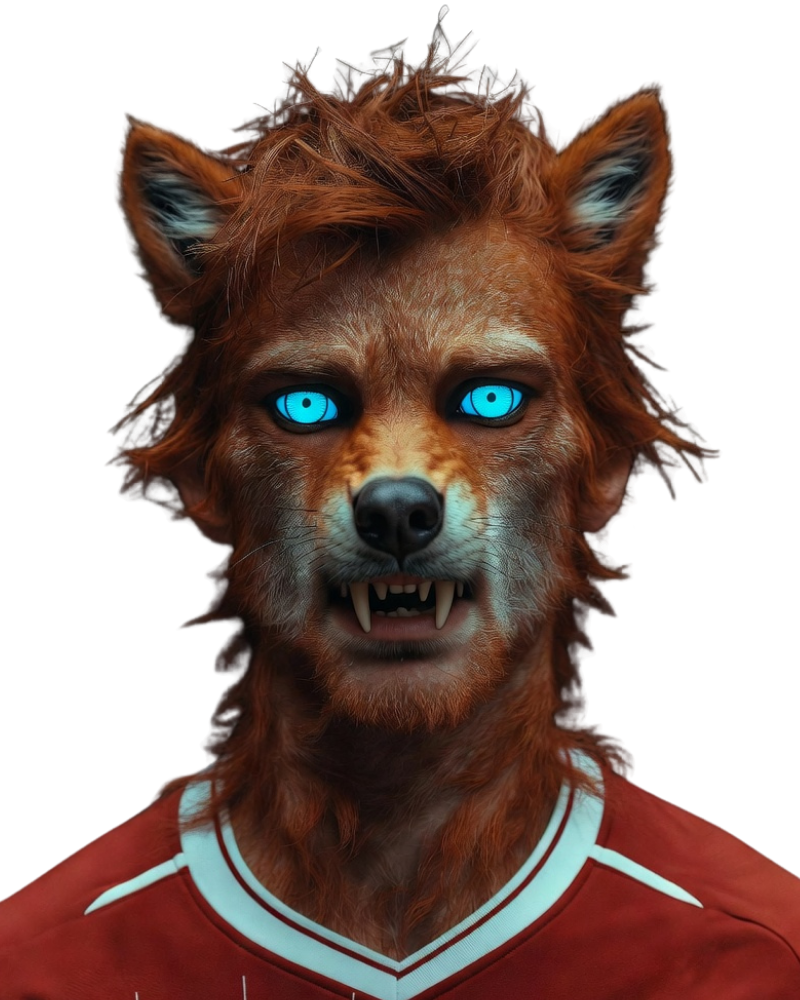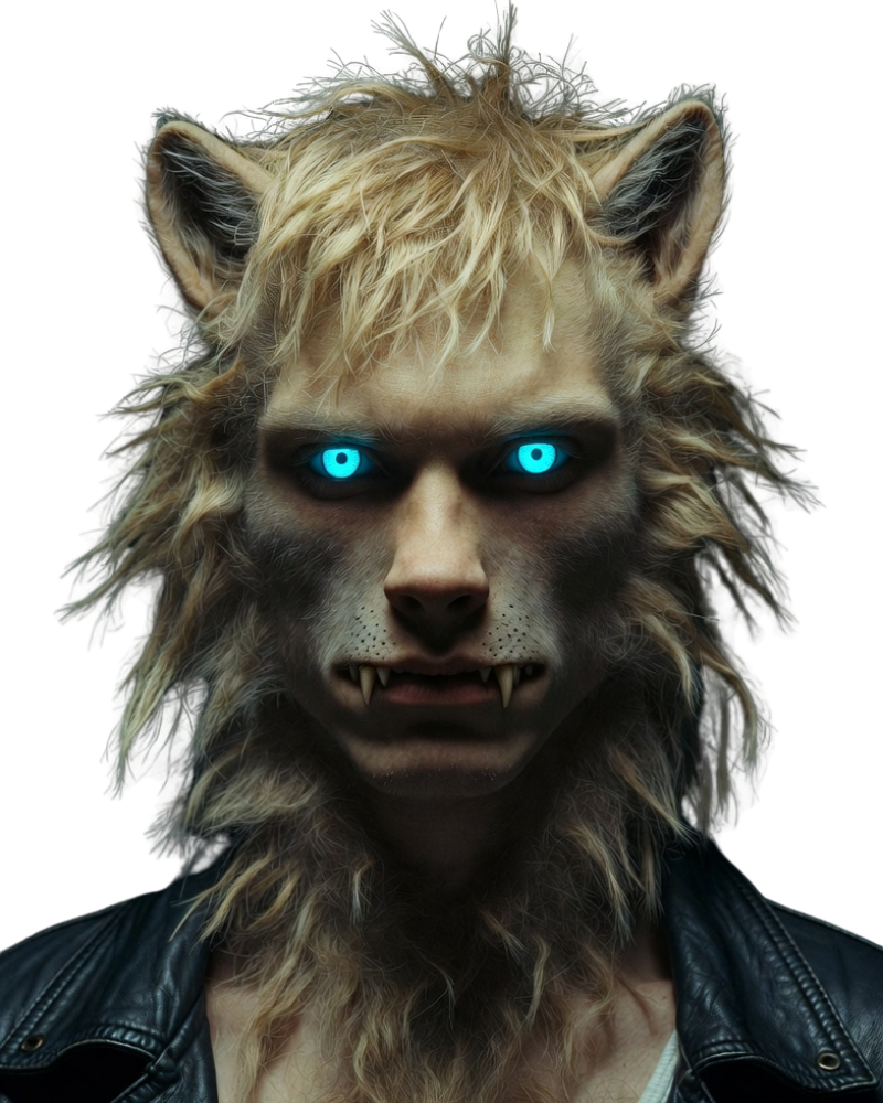 Cyberpunk wolf emerging through electric blue atmosphere.
